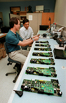 Engineering technician Ron Ho, left, works on a prototype of a transaction terminal, or smart phone, yesterday at VeriFone's facility at Mililani Technology Park as Ramanathan R, from VeriFone's operations in Bangalore, India, watches. Photo by Dennis Oda, Star-Bulletin