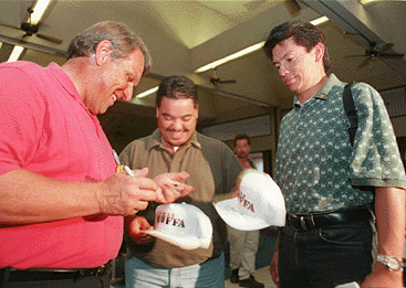James Hoffa Jr., left, autographs hats for Danny Guerrero, center, and