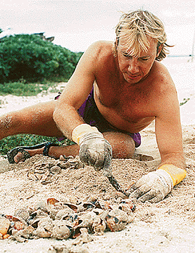 The energy these marine reptiles need for such intense reproductive activity is extensive. A female must drag herself above the high waterline of beaches, some strewn with rocks or vegetation, to search for suitable nesting sites. When she finds one, she uses her front flippers to scoop out a body pit and then, with rear flippers, digs a deeper egg chamber, usually in crumbly sand. If all goes well, she then lays dozens of eggs into the hole.
