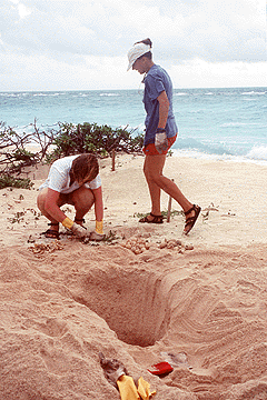 Donning rubber gloves covered with a pair of work gloves, two or three people kneel on pads near the alleged hatch pit and start scooping sand. Shovels don't work well here because of the danger of slicing through tiny turtles still trapped in the sand.