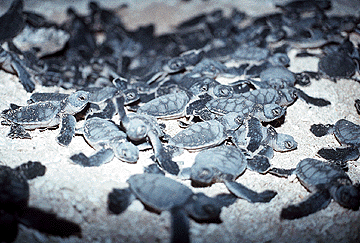 The rewards during this hand digging can be exhilarating because it is at this point that little black heads often pop out of the moist sand. Careful scooping soon frees the baby turtle, which instinctively paddles its flippers like mad in the palms of workers' hands. Rescued hatchlings go into a dark bucket where they soon settle down and become still.