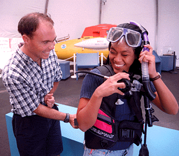 Mike Levad helps Jennifer Hermosura with diving equipment