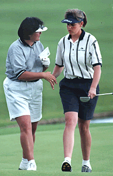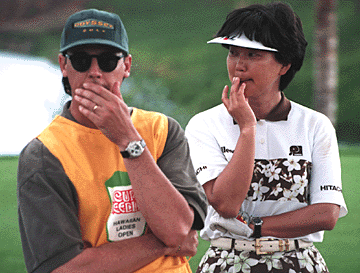 Hiromi Kobayashi, right, and her caddy worry over a ball
