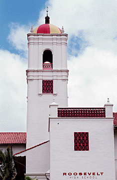 When the school was built in the early '30s, it was considered a masterpiece of municipal architecture, and it's still a very good-looking school. The faux beaux-arts, retro-Mediterranean style of architecture that came to be known as "Hawaiian" was all the rage then, and Spanish villas featured bell towers, so, naturally, Hawaiian public buildings also featured towers. Look at City Hall. The tower there is good for nothing except locking up Andy Mirikitani when he annoys John DeSoto.