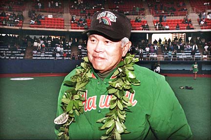 (1,079-569-4, .654), May 13, 2000 (UH 9, Hawaii-Hilo 6): Randon Ho picks up the victory and Sean Yamashita the save as the Rainbows take an early lead, then answer with more runs every time the Vulcans draw close. Nate Jackson, Kenn Wakakuwa and Aaron Pribble each have two RBIs while Darin Baker goes 3-for-4.